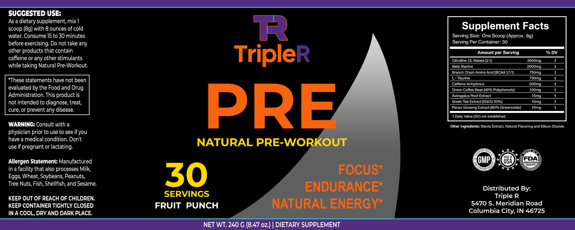 WHEN TO TAKE IT – mix 1 scoop with 8 oz. of cold water, 15-20 minutes prior to any workout. Do not take any other products that contain caffeine or any other stimulants while taking Natural Pre-Workout